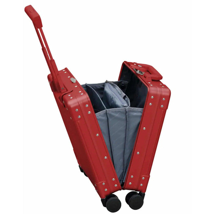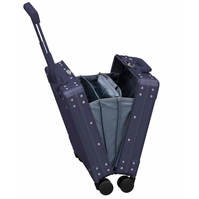 20" Vertical Rolling Business Briefcase can be a briefcase or a carry-on. It opens vertically so you can easily access your belongings while traveling. This Aircraft Grade Aluminum hard body case is extremely durable and lightweight. Secured with steel riveted construction and double reinforced aluminum corners for extra strength.
