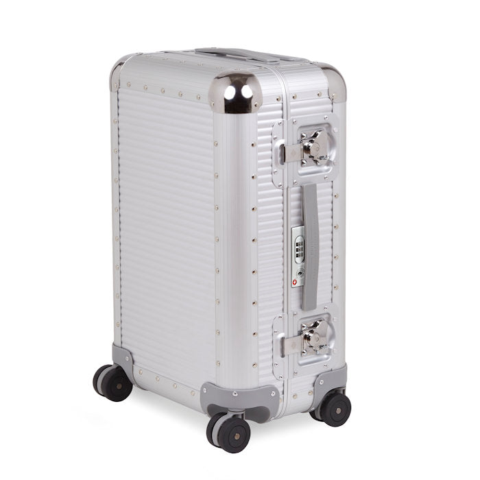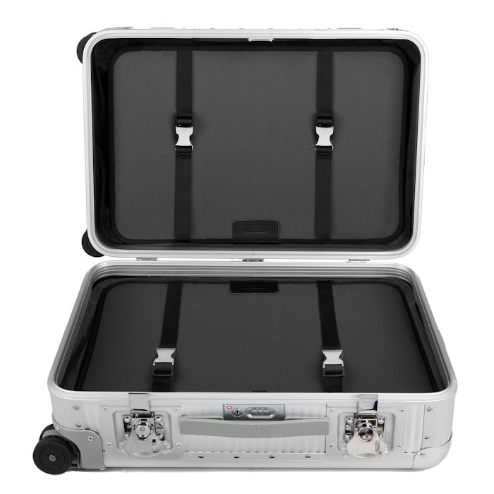 100% aluminum. 4-wheeled made in Italy checked luggage. The dual wheels guarantees great stability and smoothness. The suitcase has a TSA lock incorporated combined with two maxi butterfly locks ensures safety. The interior of the suitcase is made of polyester removable lining and come complete with elastic straps in both sides that make the interior well arranged: the nickel clip embellish the product.