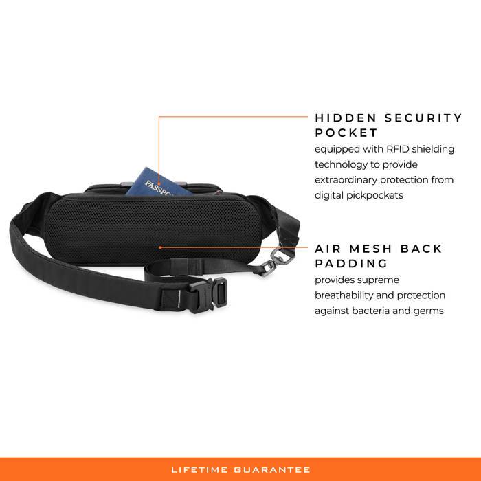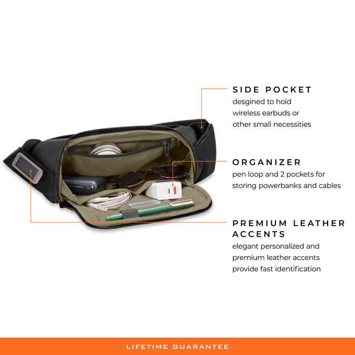 - Hands free, versatile carrying options: crossbody or use as a hip pack