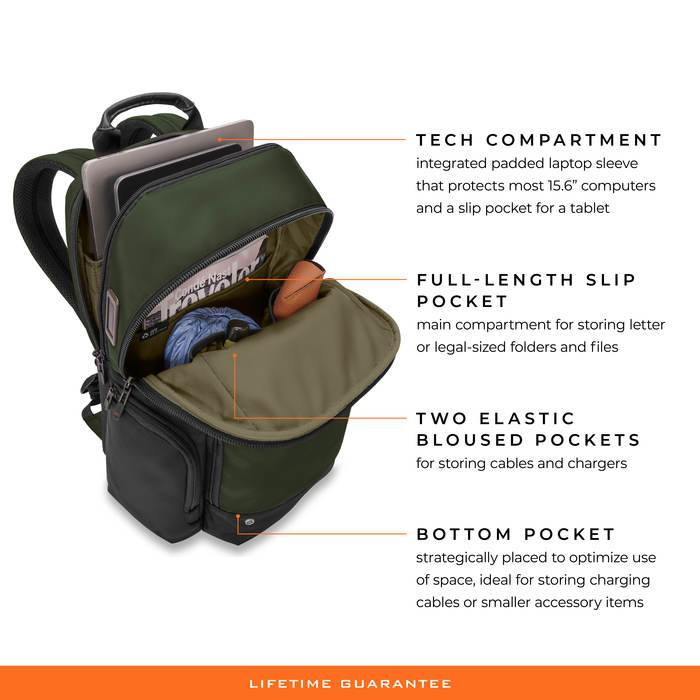 Tech compartment includes an integrated padded laptop sleeve protects most 15.6" computers and slip pocket for a tablet.