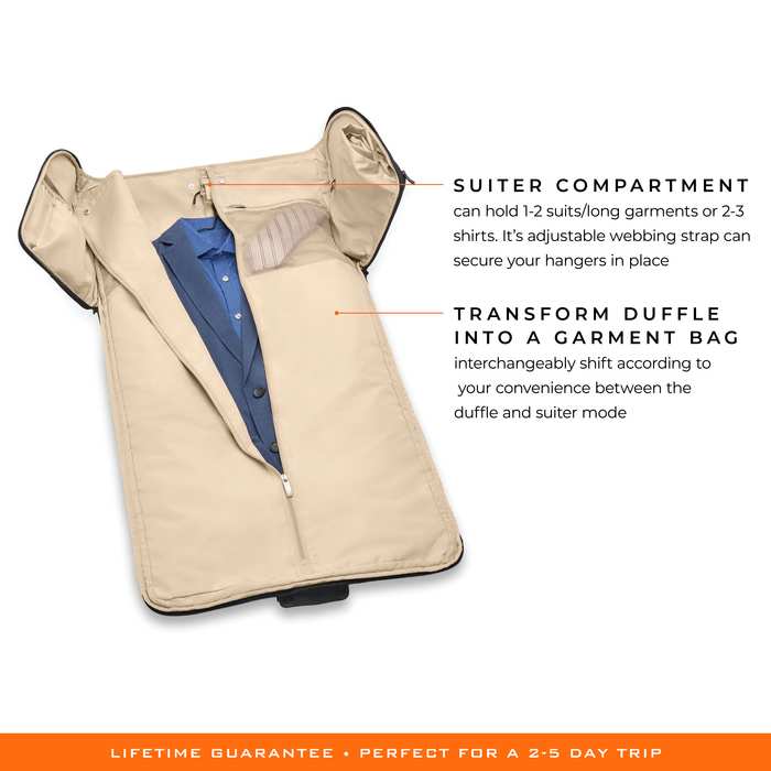 - Versatility to fit your needs by transforming duffle into a garment bag for securing your formal attire.