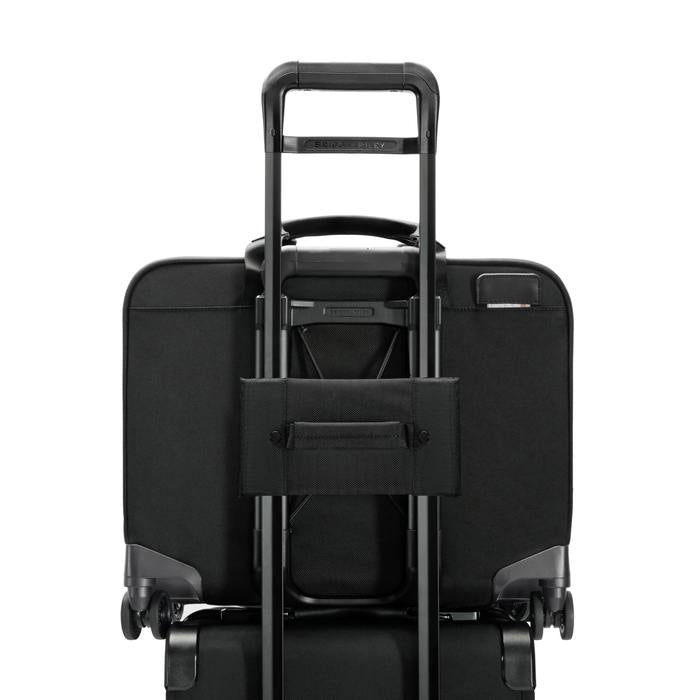 Transport two bags as one with the interlocking handle system. Stack bag on a Briggs & Riley wheeled luggage.
