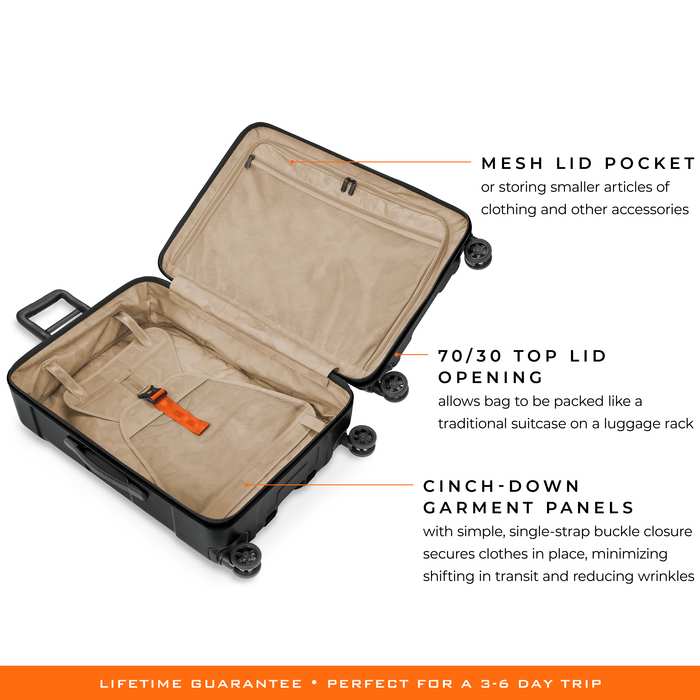 - 70/30 lid opening allows bag to be packed like a traditional suitcase on a luggage rack.