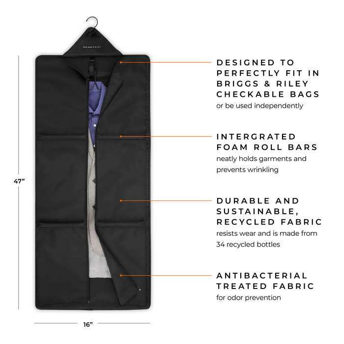 Keep your clothing wrinkle-free with this sleek garment sleeve that can be packed in our check-in luggage or used independently. The integrated closure hook doubles as hangable feature to hang and organize your items with ease.