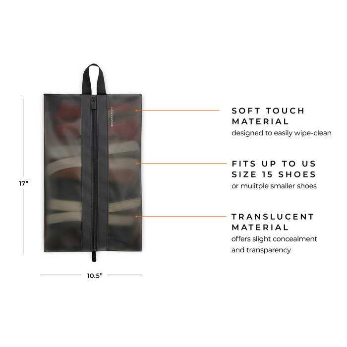 To avoid damaging or wrinkling your garments, pack your large shoes, boots, heels, and more, in this translucent shoe pouch. It's sleek design is easily wipeable while also providing extraordinary protection from scuffs and scratches.