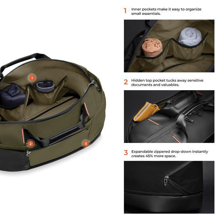 - Drop-down zippered expansion instantly creates 45% more room in the bottom of your bag.