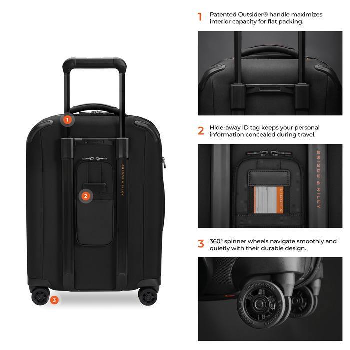 Now with a wider body, our Global 21” Carry-On Spinner makes it easy to skip bag check. Go beyond essentials with a space-saving exterior mounted Outsider® handle and 2” of expandable packing room. With travel-smart advantages like external phone charging and quick access to checkpoint essentials, your international flight is about to get upgraded.