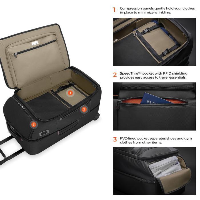 - Compression panels gently hold your clothes in place to minimize wrinkling.
