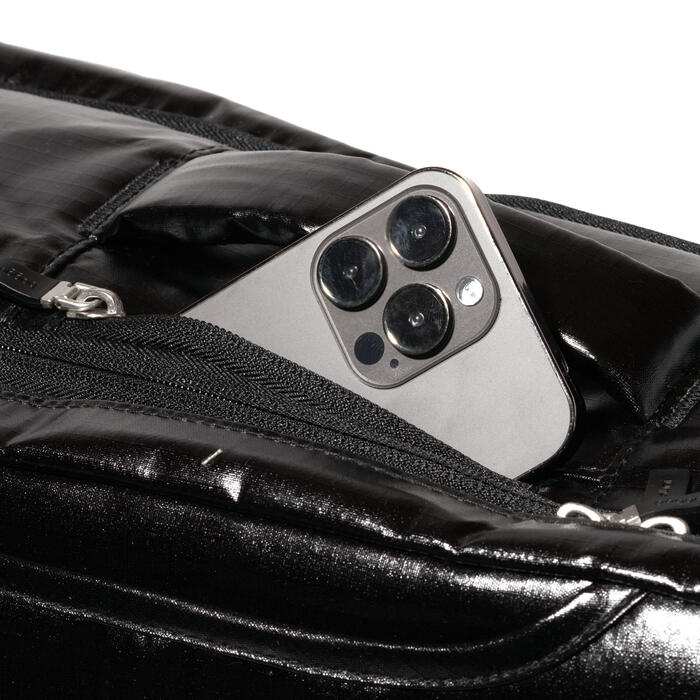 Expandable side pocket zips flat for slim profile or expands to accommodate large water bottle