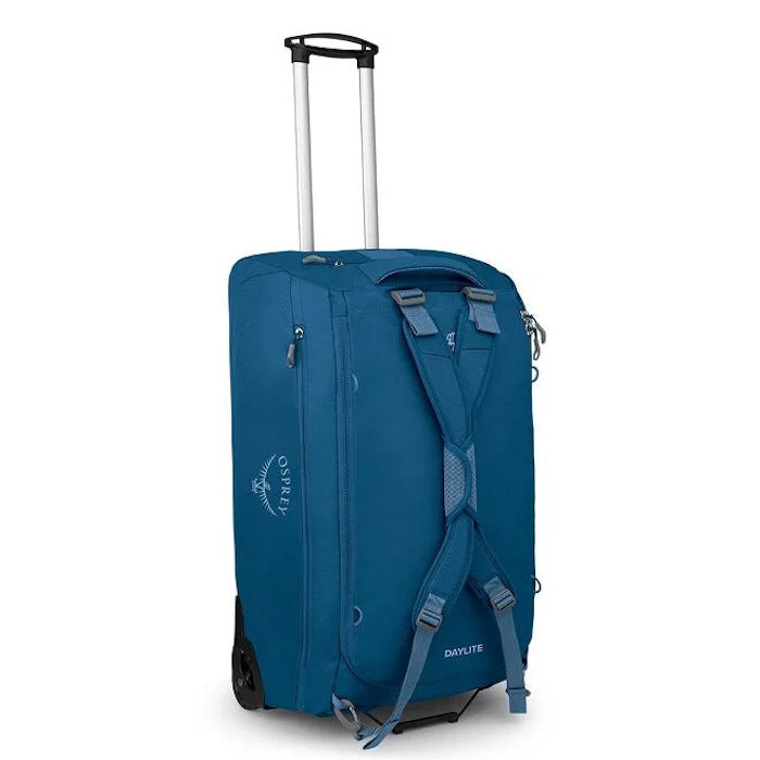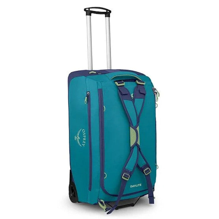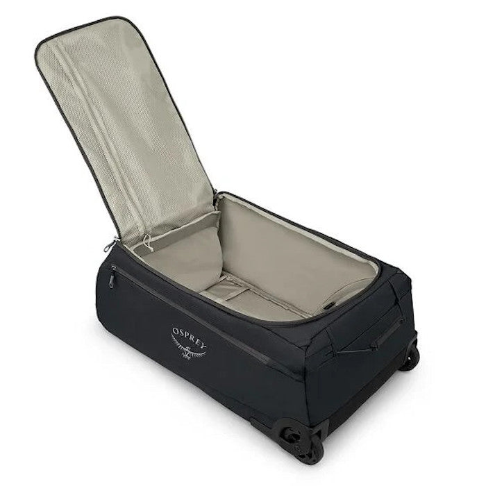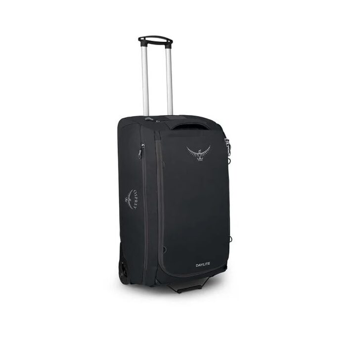 Osprey 85 liter Wheeled Duffel. Two-wheel system with protective rails & fabric kickplate, locking push button trolley, stands upright on its own. Patented collapsible design.
