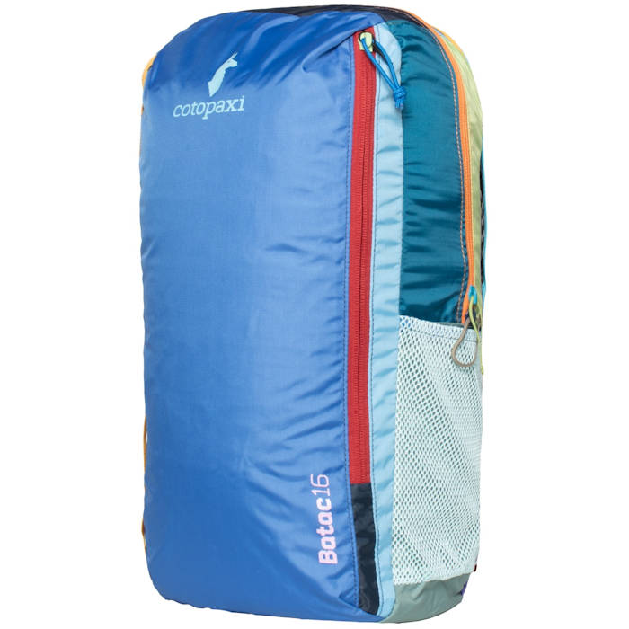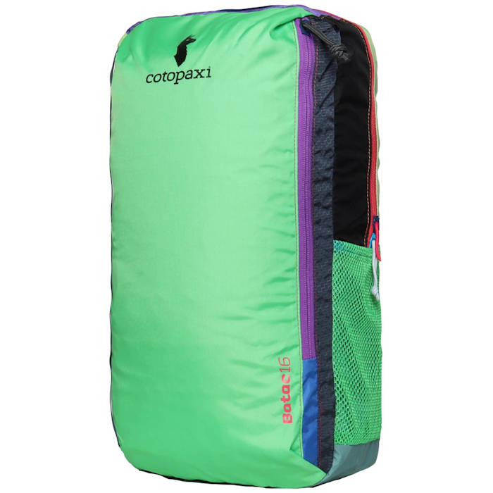 A streamlined pack that deploys for fast-and-light daytrips, hikes, and other excursions. It’s unstructured for easy loading and features a main zippered compartment along with a front vertical-zip pocket and two mesh water bottle pockets. Adjustable web strap with a quick release side closure. (Re)purposed from remnants, durable ripstop nylon fabric is cut into lightweight, color blocked accessories. Each piece is unique with a one-of-a-kind Colorway. Available in 24L larger size