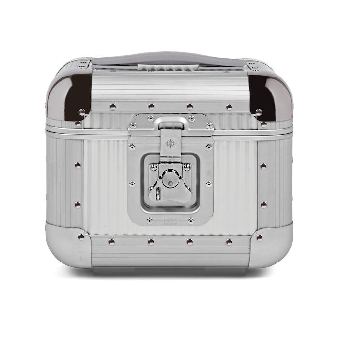 100% Aluminum, Vanity case made in Italy. Handcrafted Leather details include the top handle and the internal details. The interior organizer is enrichened by adjustable leather straps and removable cases that allow for an optimum arrangement of contents.