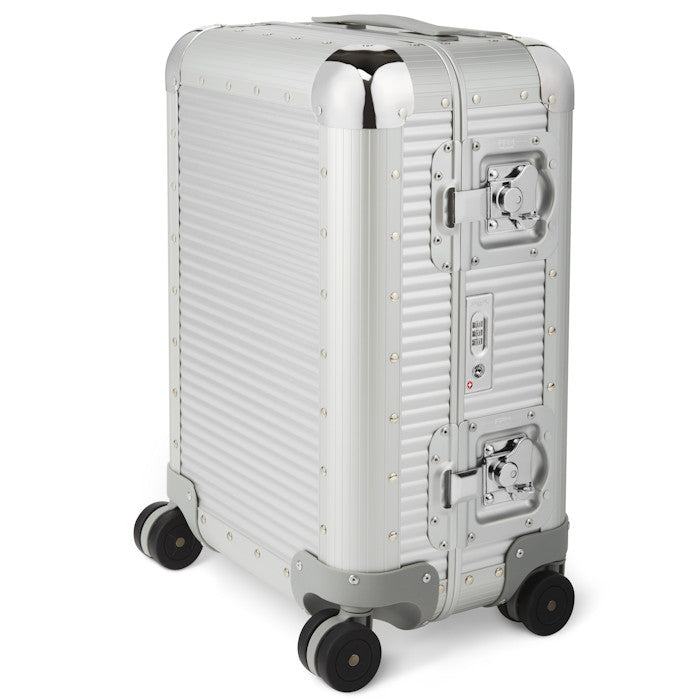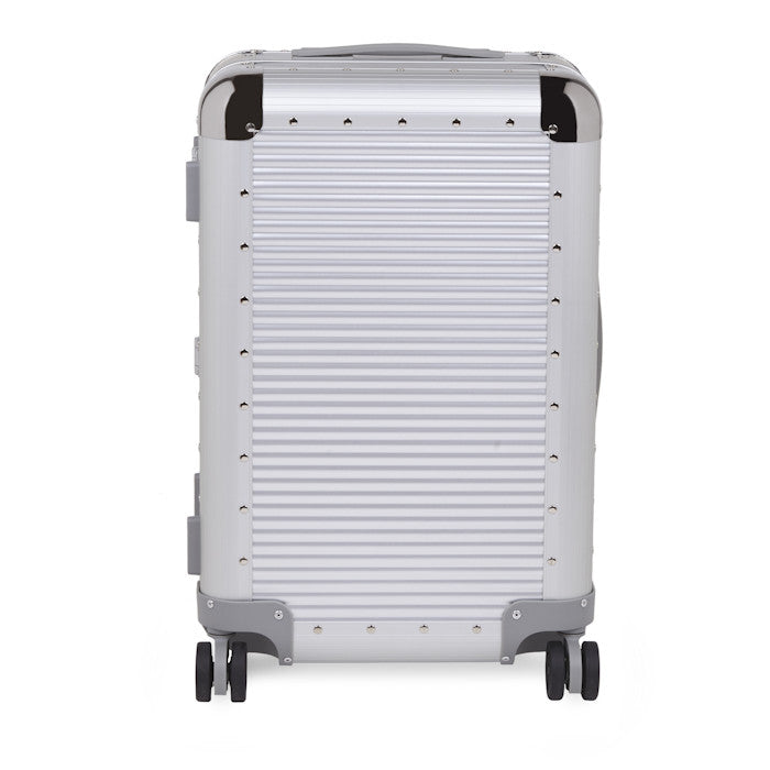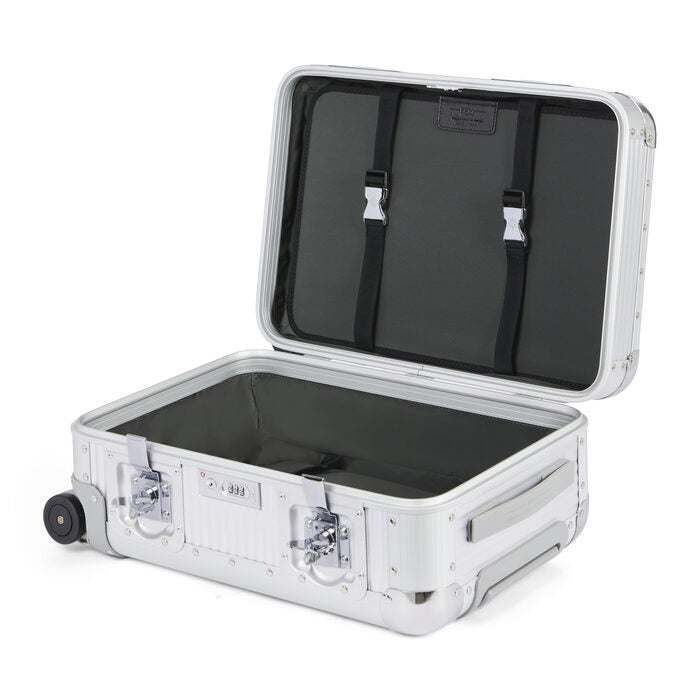 100% Aluminium. 4-wheeled made in Italy cabin bag. The dual wheels guarantee great stability and smoothness. The suitcase has a TSA lock incorporated combined with two maxi butterfly locks that ensure safety.The two handles are in non-slip rubber. The interior of the suitcase is made of removable lining and come complete with elastic straps in both sides that make the interior well arranged: the nickel clip embellish the product. Ideal for 2/3-day journeys.