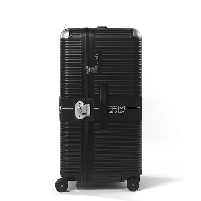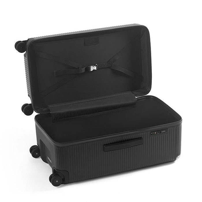 Premium polycarbonate, meticulously designed to embody both featherweight durability and functionality. Its defining feature is the innovative zip closure, seamlessly blending style with convenience. The distinctive elastic band, adorned with an embroidered logo, elegantly fastens alongside the iconic aluminum butterfly lock—a timeless hallmark of the brand.