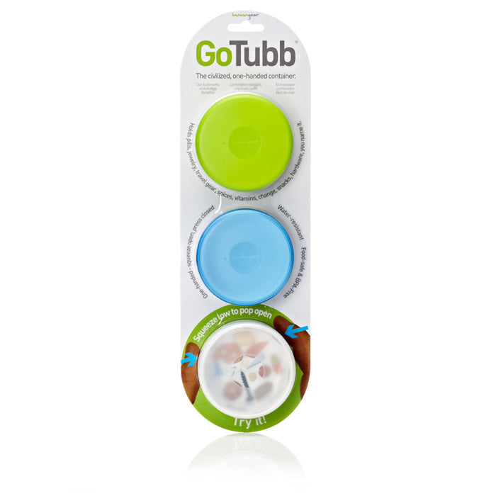 Patented worldwide, the GoTubb's ingenious design opens and closes with just one hand. Just squeeze the sides and the lid is released. To close, simply press back on. For everything that you can't squeeze out of a GoToob, there's GoTubb. Great for pills, knick-knacks, snacks, vitamins, change, or just about anything. Food-safe (FDA) and 100% BPA-free, PC-free, phthalate-free and completely recyclable