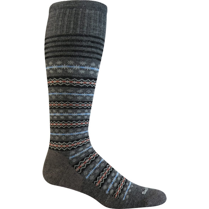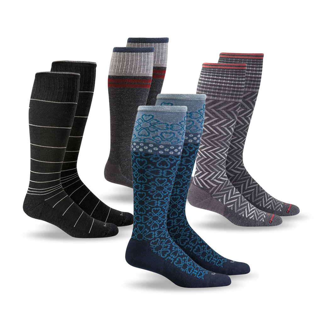 Travel in comfort & style! Graduated compression socks promote circulation while minimizing fatigue and swelling. Feel Better in Style – at every age and in everything you do.Feel better in socks made in stylish patterns of a blend of homegrown merino wool with bamboo rayon/nylon/spandex that keeps feet dry and provides 15-20 mmHG moderate graduated compression to promote circulation, reduce fatigue, and minimize swelling. Assorted Patterns.