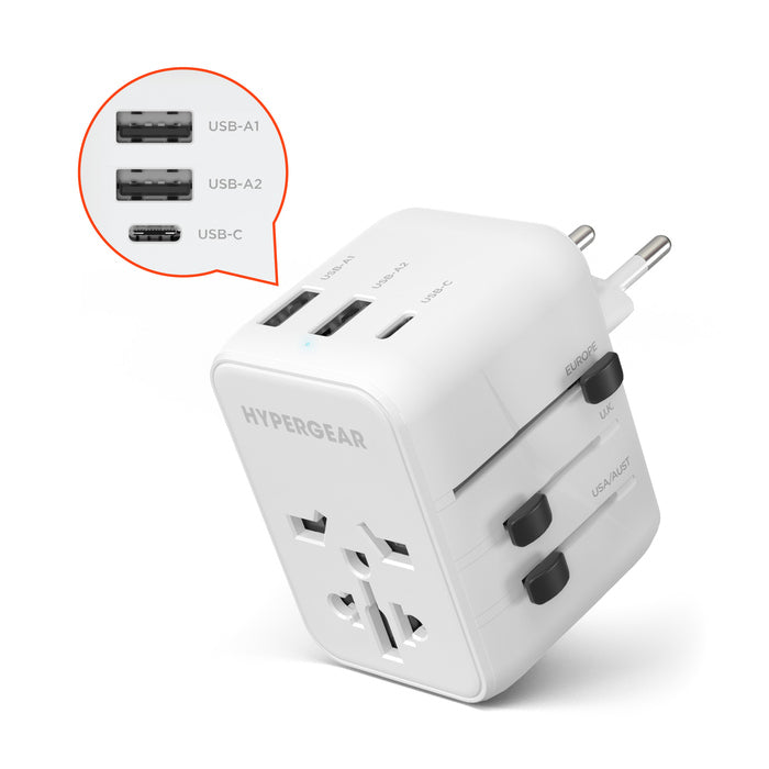 WorldCharge Universal Travel Adapter with USB-C. Travel adapter for 150+ countries. White.