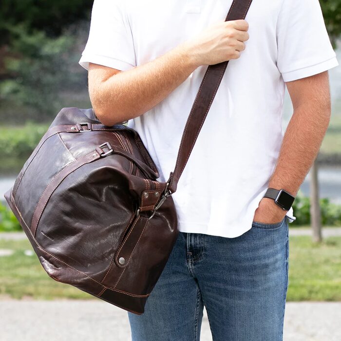 Pack your gear and essentials for the day or for a longer trip in the Voyager Leather Duffle Bag. Handmade from full-grain buffalo leather, this bag will build a rich, luxurious patina as it ages. This bag has the perfect amount of space for clothing, shoes, and personal items. The zippered outside back pocket allows you to keep your phone or wallet close at hand. Soft yet durable, use it as a carry-on or a day bag. An adjustable/removable shoulder strap can be worn on your shoulder or across your chest.