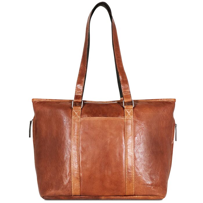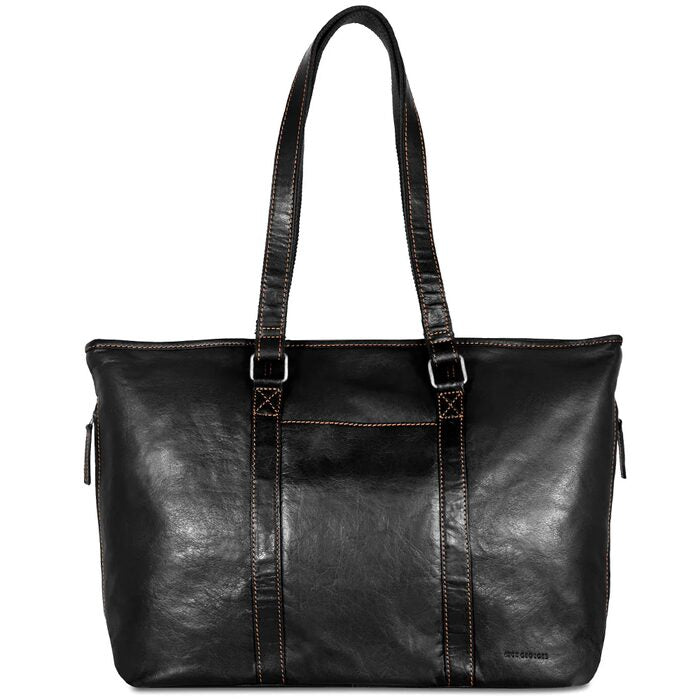 This Voyager leather shopper tote bag offers style and function for day to day use. It is made from full-grain buffalo leather for added durability and has a clean vintage design with two top handles that make it comfortable to carry. This soft-structured tote bag has a large central section with plenty of room for your files, documents, and accessories. Top zip closure to keep your things secure. The interior includes a zippered pocket and organizer pockets. On the outside, you will find open front and back pockets and a zippered pocket on each gusset to conceal your wallet or mobile device.