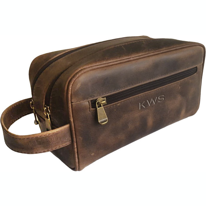 Rugged, Colombian Vaqueta will develop a rich patina over time. May be personalized. Distressed Brown, accented with antiqued metal hardware. By LW Select.
