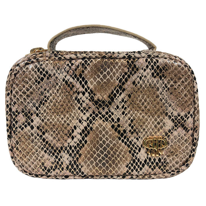 Clever beauty and jewelry organizers are finished in vegan leather with trendy patterns. Packing was never so easy or stylish! Gold Python.