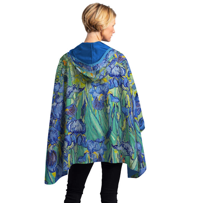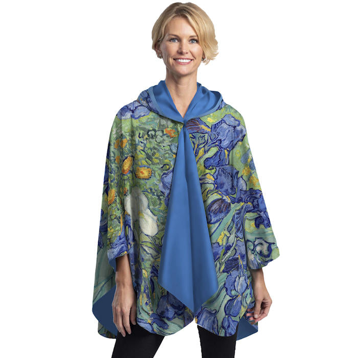 Van Gogh Irises print. Rain Cape is a reversible rainproof poncho that’s breathable, silky-soft, & lightweight.