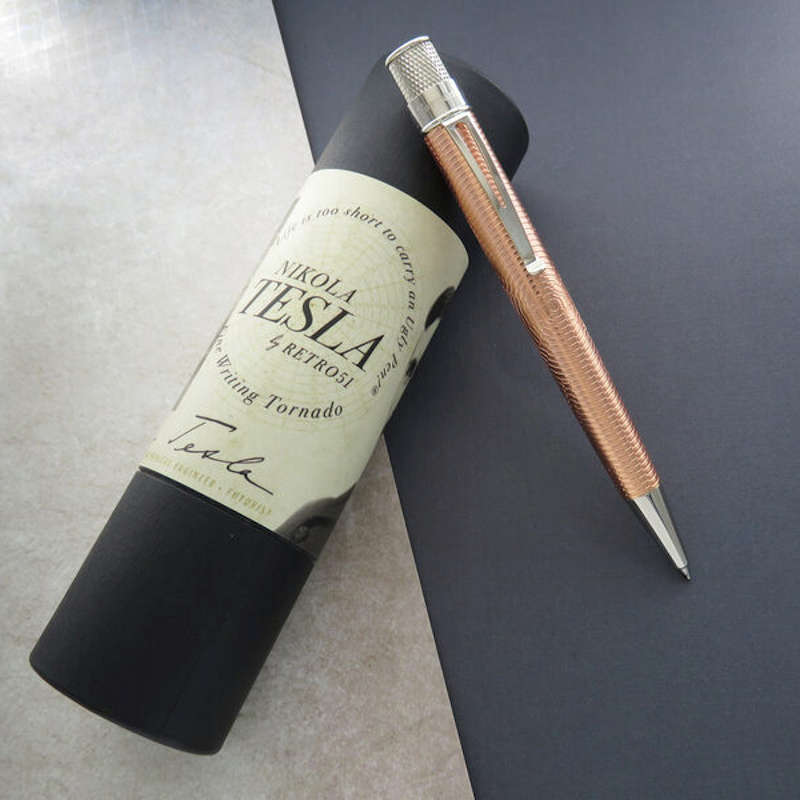 Futurist, inventor, electrical and mechanical engineer, Nikola Tesla was a genius well ahead of his time. His inventions are still being used to this day and his theories were so advanced that they continue to be studied, experimented on and even power the modern world. This Tornado's design was inspired by Tesla's spiral coil used in his wireless power experiments. Concentric circles are acid-etched into the barrel then plated in copper and finished with platinum appointments giving it a radiant and magnetic aesthetic. Each rollerball is loaded into a commemorative packaging tube that doubles as a pen stand when not in use.