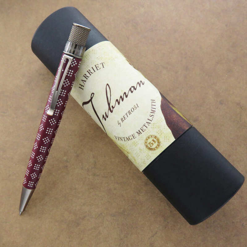 Harriet Tubman Tornado Vintage Metalsmith Rollerball. Harriet's headscarf is replicated on top of a stainless barrel, with antique silver trim and her portrait on the finial. May all who write with this pen be moved by Tubman's daring, courage and generosity.