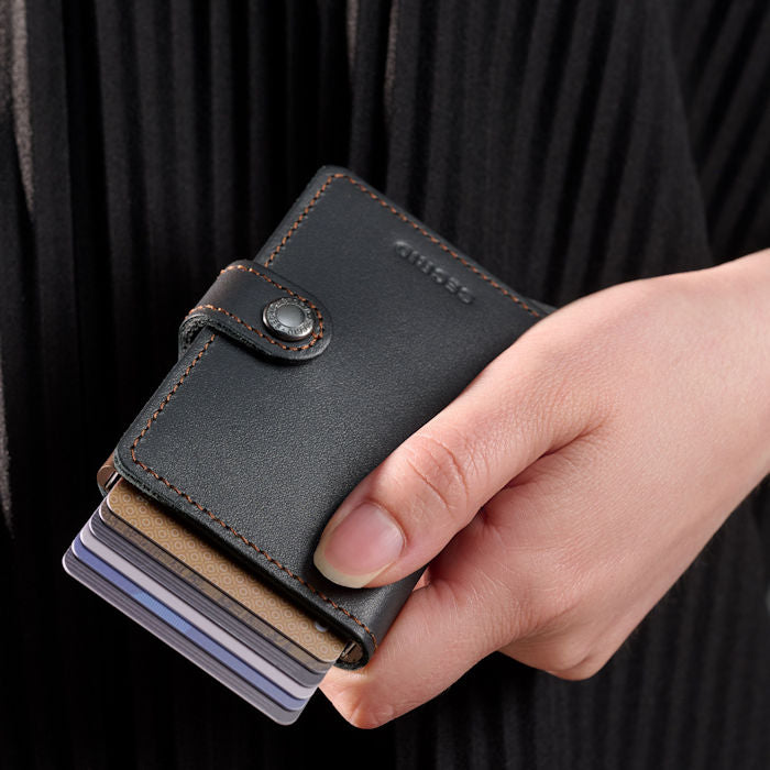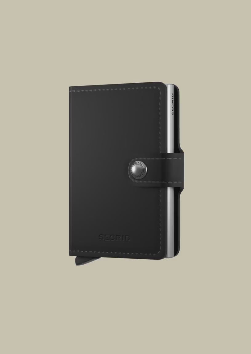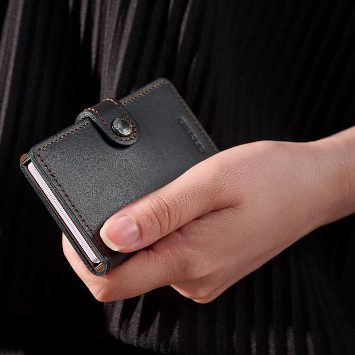 Small in size and surprisingly large in storage capacity, the Miniwallet combines the best of both worlds. The exterior holds banknotes, receipt and cards, while the aluminum card protector allows you to slide out cards with one simple motion and protects them from bending, breaking and unwanted wireless communication. Smooth semi-aniline finish. European cowhide. Holds: