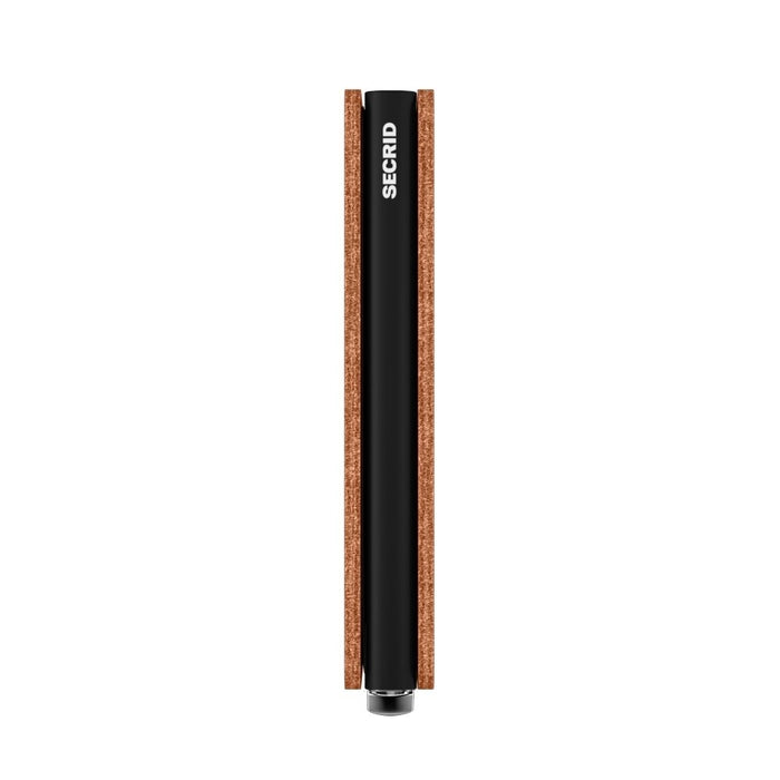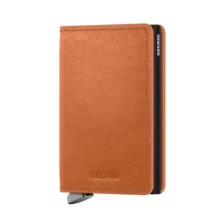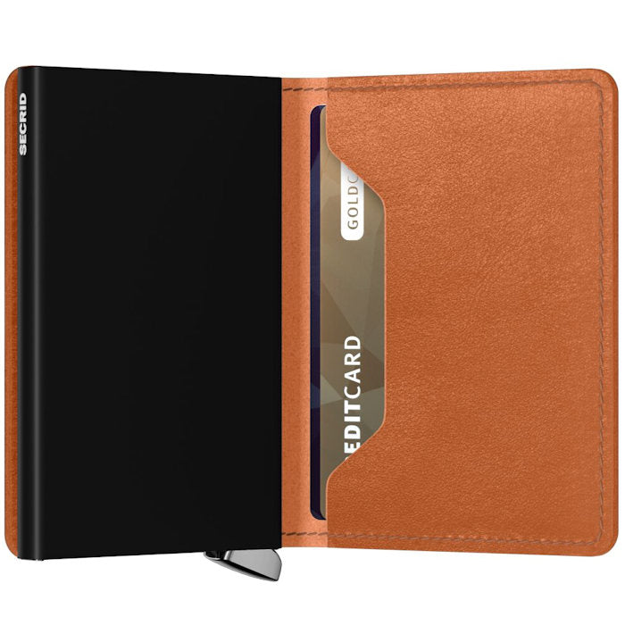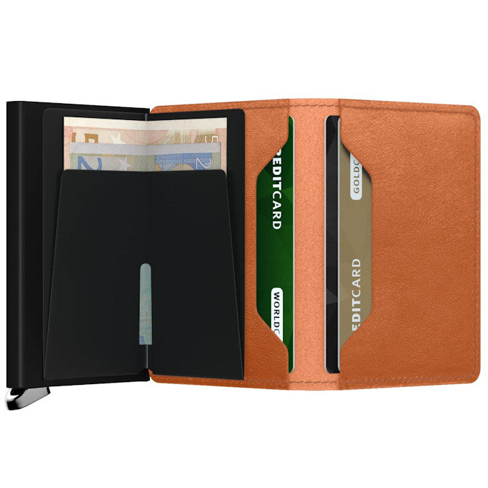 Our Basco leather wallets are tanned by Tuscan leather artisans. La Bretagna, a family-owned business, is a pioneer in the sustainable production of vegetable-tanned leather. The remarkably deep colours are the effect of this vegetable tanning process. One of the main characteristics of this type of leather is that it ages in a beautiful way. Its eye-catching metal silver colored lever is made from durable stainless-steel metal and especially crafted for this collection. The Slimwallet's open exterior wrap does not feature a button or magnet closure system.Holds: