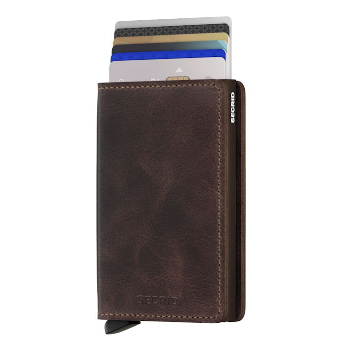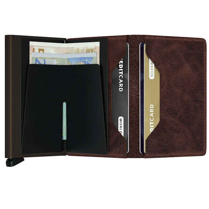 Our Vintage leather has a carefully abraded surface and a wax finish that gives a stonewashed look. Aniline dyed European cowhide. The billfold reinvented. Its slim profile allows the Slimwallet to fit perfectly into any pocket. The open exterior is designed extra wide to accommodate cards, banknotes and receipts. The card protector mechanism enables you to slide out cards with a simple motion, while the aluminum construction protects your cards from bending, breaking and unwanted wireless communication. The Slimwallet's open exterior wrap does not feature a button or magnet closure system. Holds: