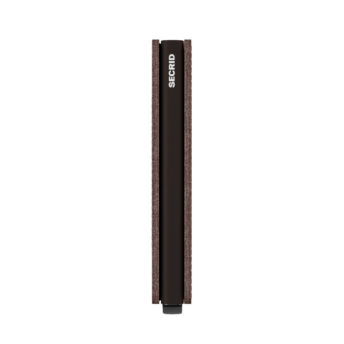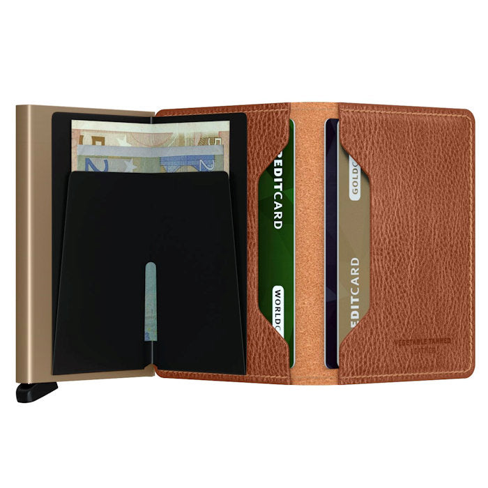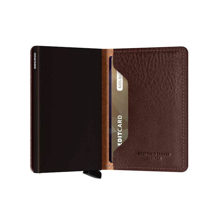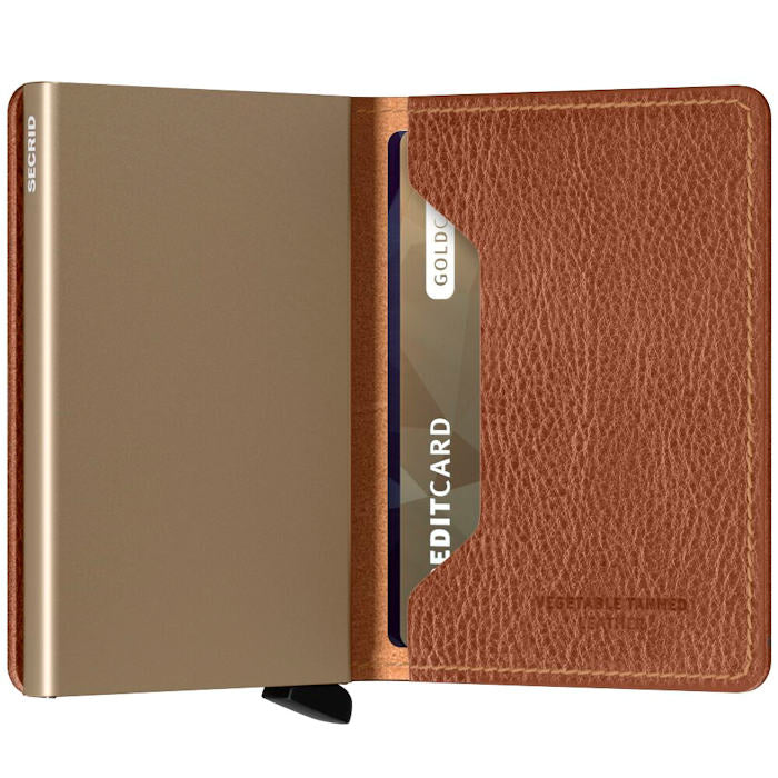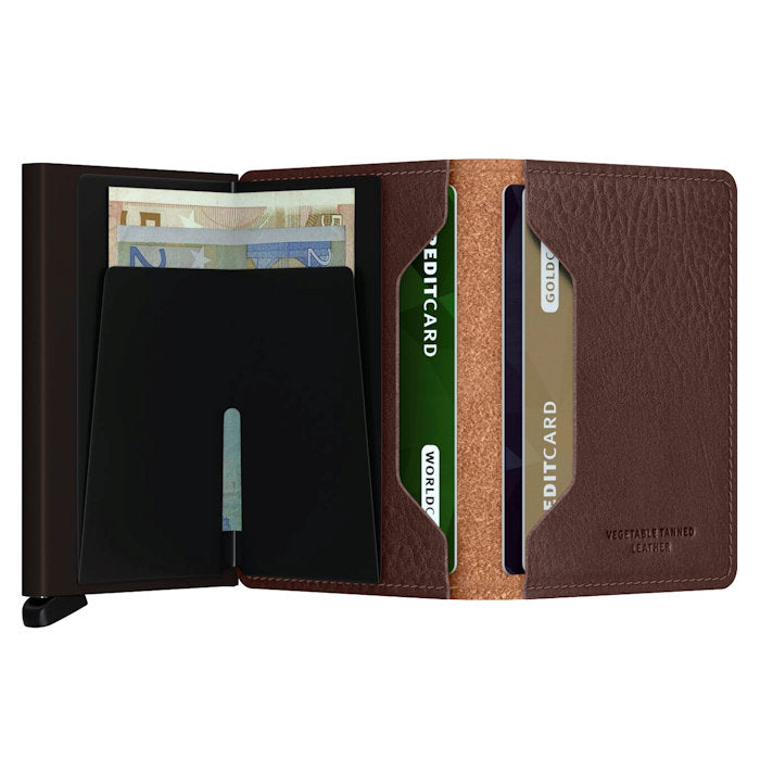 An Italian family tannery employs the traditional process of vegetable tanning to make this distinctive leather age beautifully. Made of European cowhide, The billfold reinvented. Its slim profile allows the Slimwallet to fit perfectly into any pocket. The open exterior is designed extra wide to accommodate cards, banknotes and receipts. The Card protector mechanism enables you to slide out cards with a simple motion, while the aluminum construction protects your cards from bending, breaking and unwanted wireless communication. The Slimwallet's open exterior wrap does not feature a button or magnet closure system. Holds: