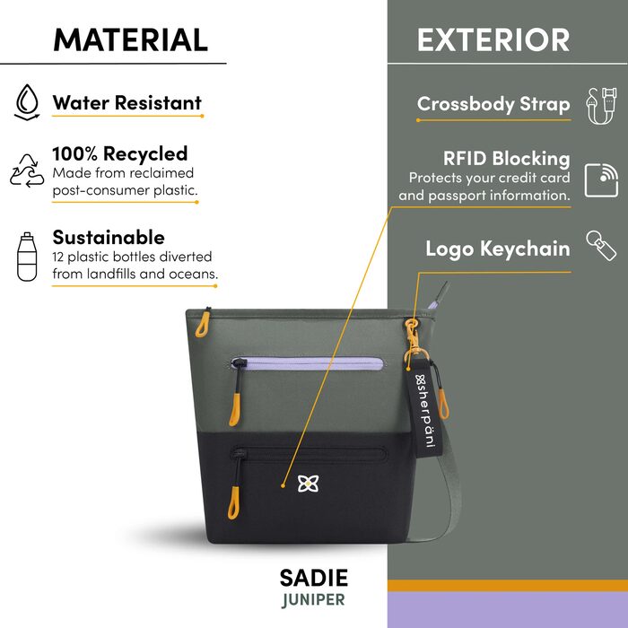 Your next everyday crossbody bag! The Sadie keeps you organized with two external zipper pockets, and a third easy-access one on the side. Made with recycled material, the Sadie is complete with an adjustable crossbody strap and a light-colored interior for easy rummaging. A tried and true Sherpani classic.