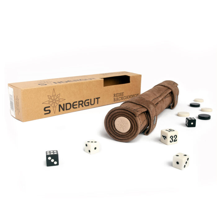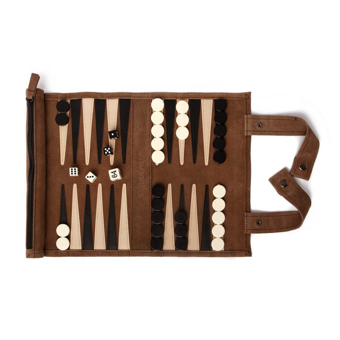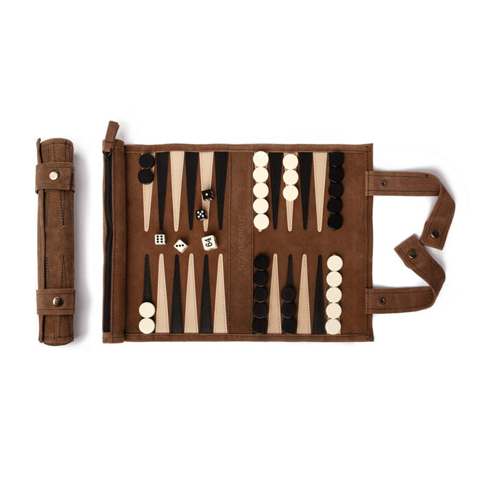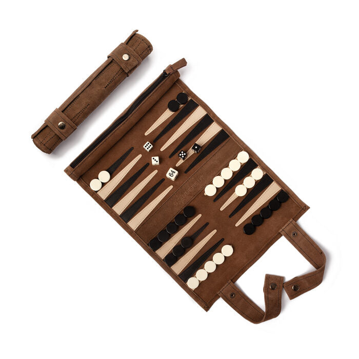 Sondergut Travel Backgammon. Unroll this timeless game to play anywhere. Durable suede and leather. Pieces included.