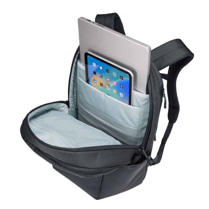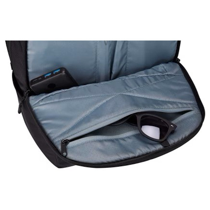 Elevated, zipped mesh pocket keeps cords and other small items separated and easy to store & find