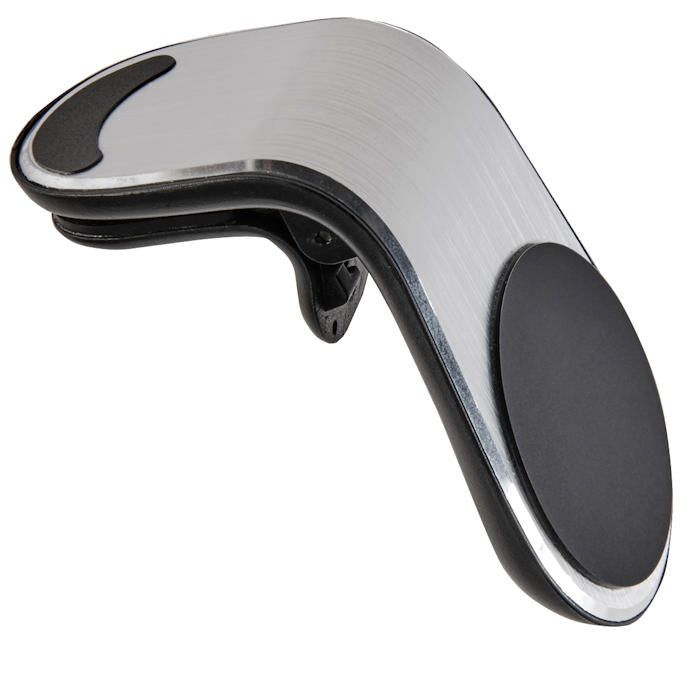 Be safe when driving. Clip-on holder allows hands-free cell phone use on either a vertical or horizontal vent panel. Silver.