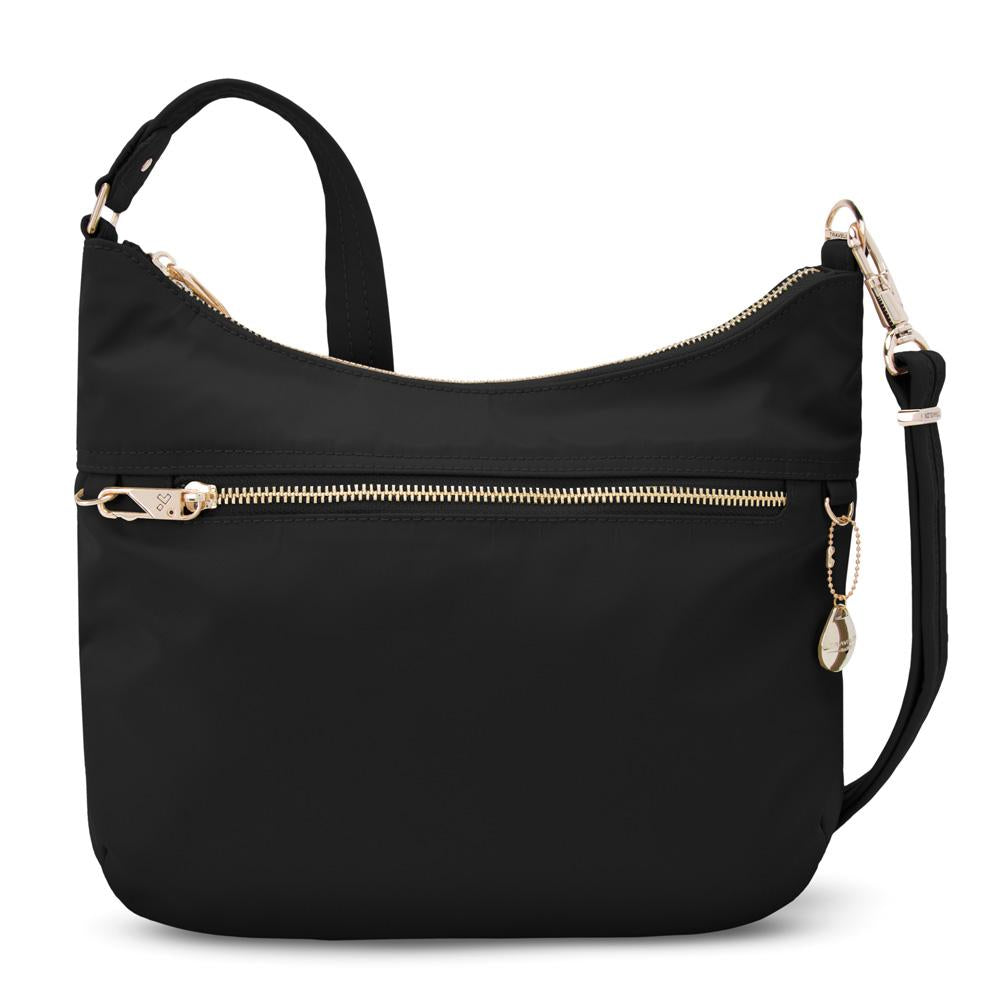 A spacious and smartly secure, Hobo style travel hand bag that is designed with a locking main compartment with RFID-blocking material to protect a passport, ID and credit cards. By Travelon.