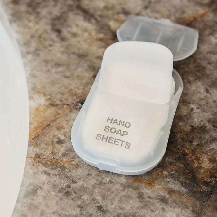 Carry biodegradable soap sheets that dissolve instantly in water, leaving you a handful of cleansing suds. 3-1-1 compliant. Perfect for the everyday journey. White.