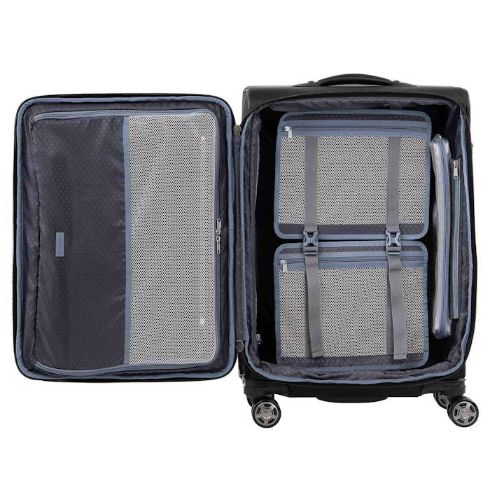 Big is beautiful with the Platinum® Elite 29" Expandable Spinner. The largest spinner in the Platinum® Elite line, this top-of-the-line suitcase is built for lasting durability with plenty of style. Ideal for long trips or multiple people, this bag also has a tip-resistant tapered expansion option that increases packing capacity another 2" when needed. A fold-out suiter guards against wrinkles and a deluxe interior tie-down system with integrated accessory pockets keeps everything organized and in place.