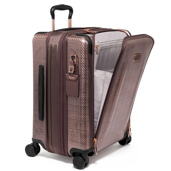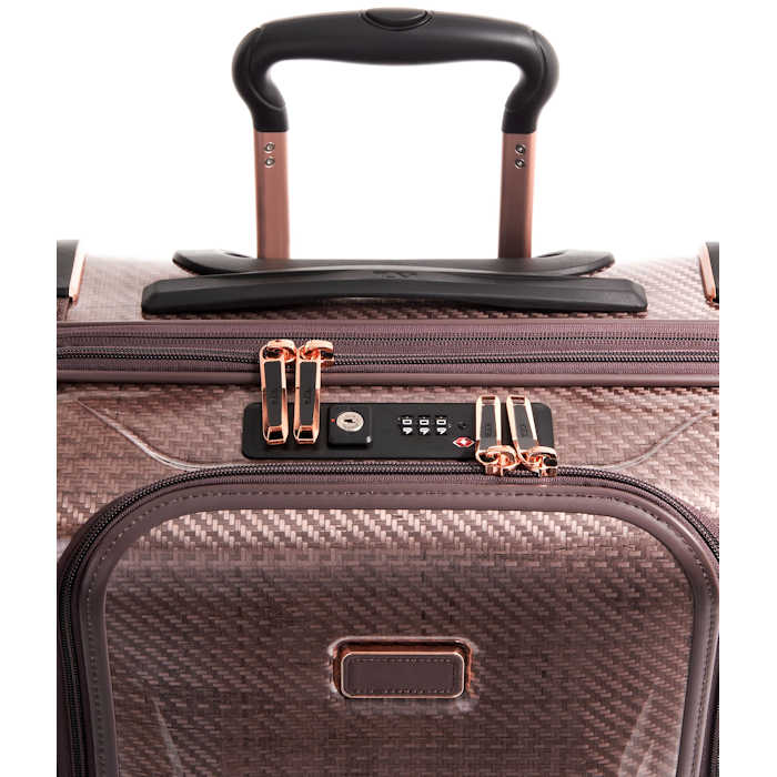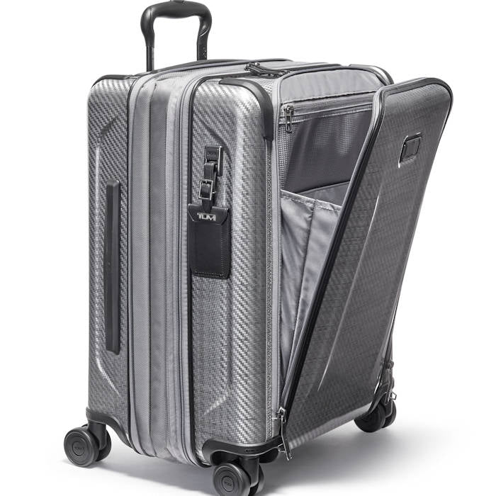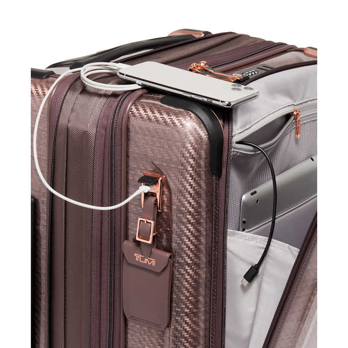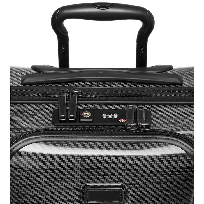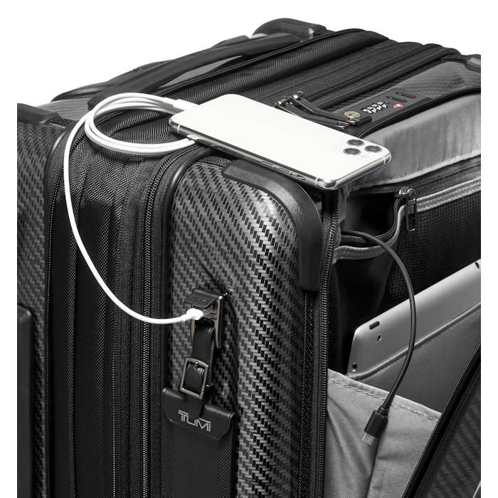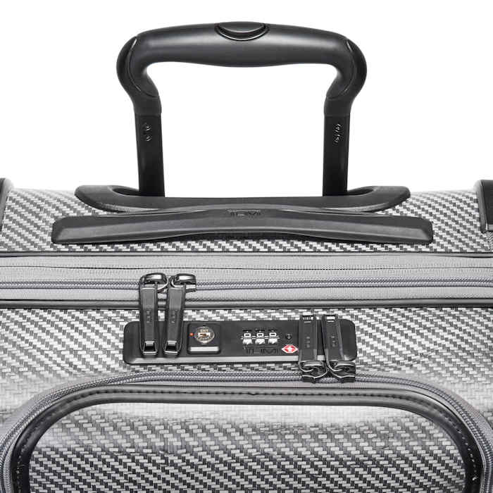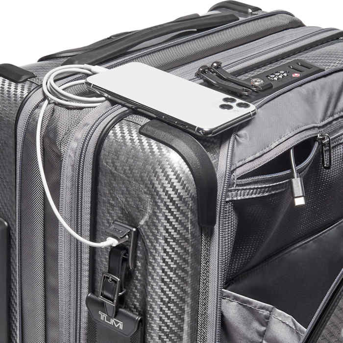 - Front U-zip pocket for extra packing space and quick access to essentials. Split case zip entry to main compartment with security zipper, Protective front and back corner bumpers, Built-in USB-C port, 3-stage telescoping handle, 4 dual spinner wheels providing stability and ease of maneuverability, Zipper expansion (up to 2" or 5 cm) with anti-warp construction, Retractable top and side grab handles, Built-in TSA combination lock, Luggage tag, TUMI Tracer®