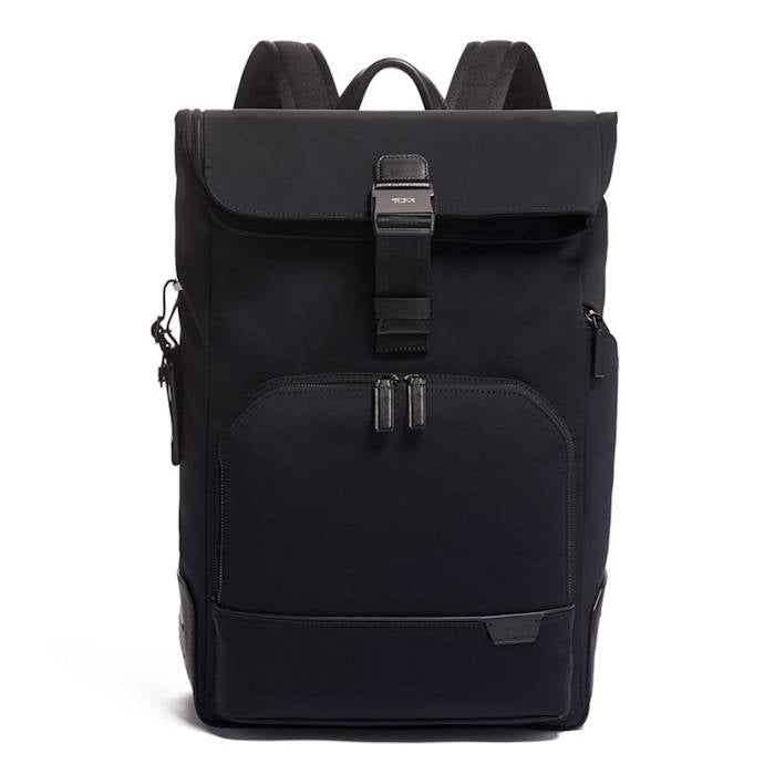- Foldover flap with front compression strap and speed clip, L-zip entry to main compartment, Zip entry to back compartment, Front U-zip pocket, Side zip pocket with water-resistant lining, Back quick-access pocket with magnetic snap, Leather top handle, Leather-accented padded adjustable backpack straps, Add-a-Bag sleeve