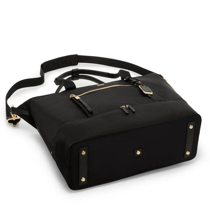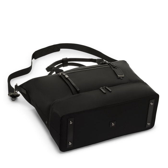 - Zip entry to bottom compartment; Snap to hold zip-around lining that separates top and bottom compartments; Zip pocket; TUMI Tracer®; Open pocket; Media pocket; Water-resistant water bottle pocket; Leather card pocket; Loops & D-ring compatible with select TUMI+ accessories; Leather pen loop; Key leash