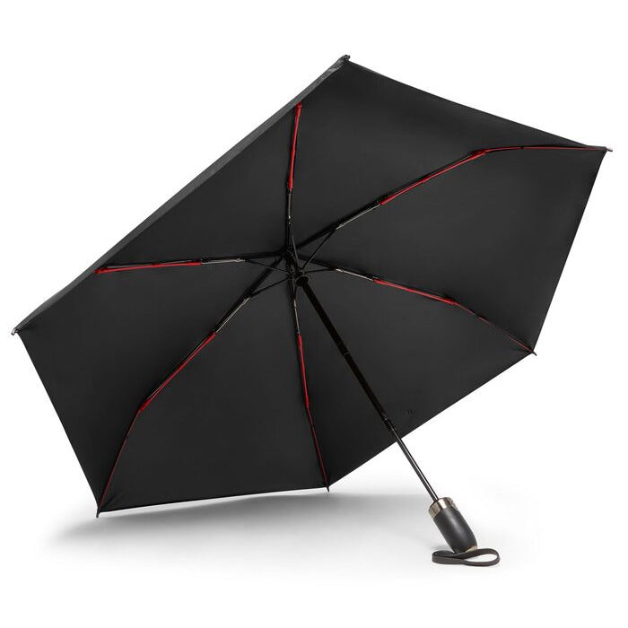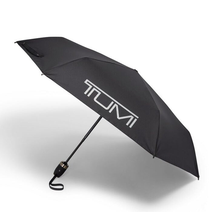 Protect yourself from the elements with this wind-resistant medium-sized umbrella, featuring interior red accents and a reflective trim. It opens and closes with a simple push of a button and comes with a reusable pouch for easy storage. Black with TUMI Red interior accent.