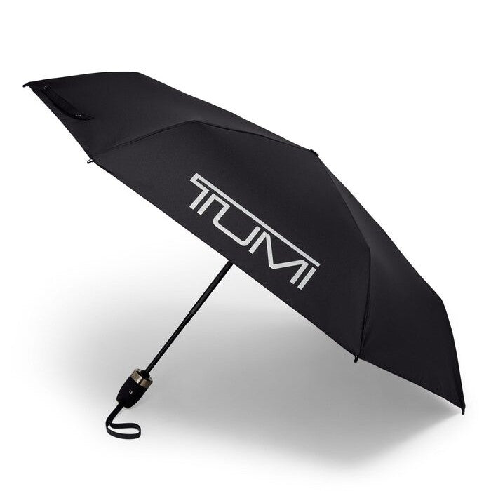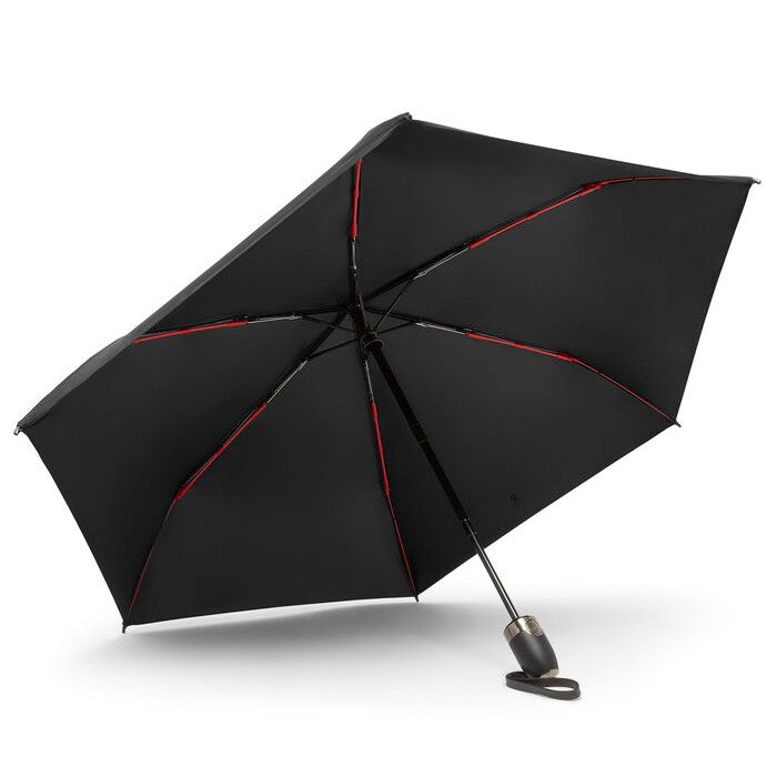 Protect yourself from the elements with this wind-resistant small umbrella, featuring interior red accents and a reflective trim. It opens and closes with a simple push of a button and comes with a reusable pouch for easy storage. Black with TUMI Red interior accent.